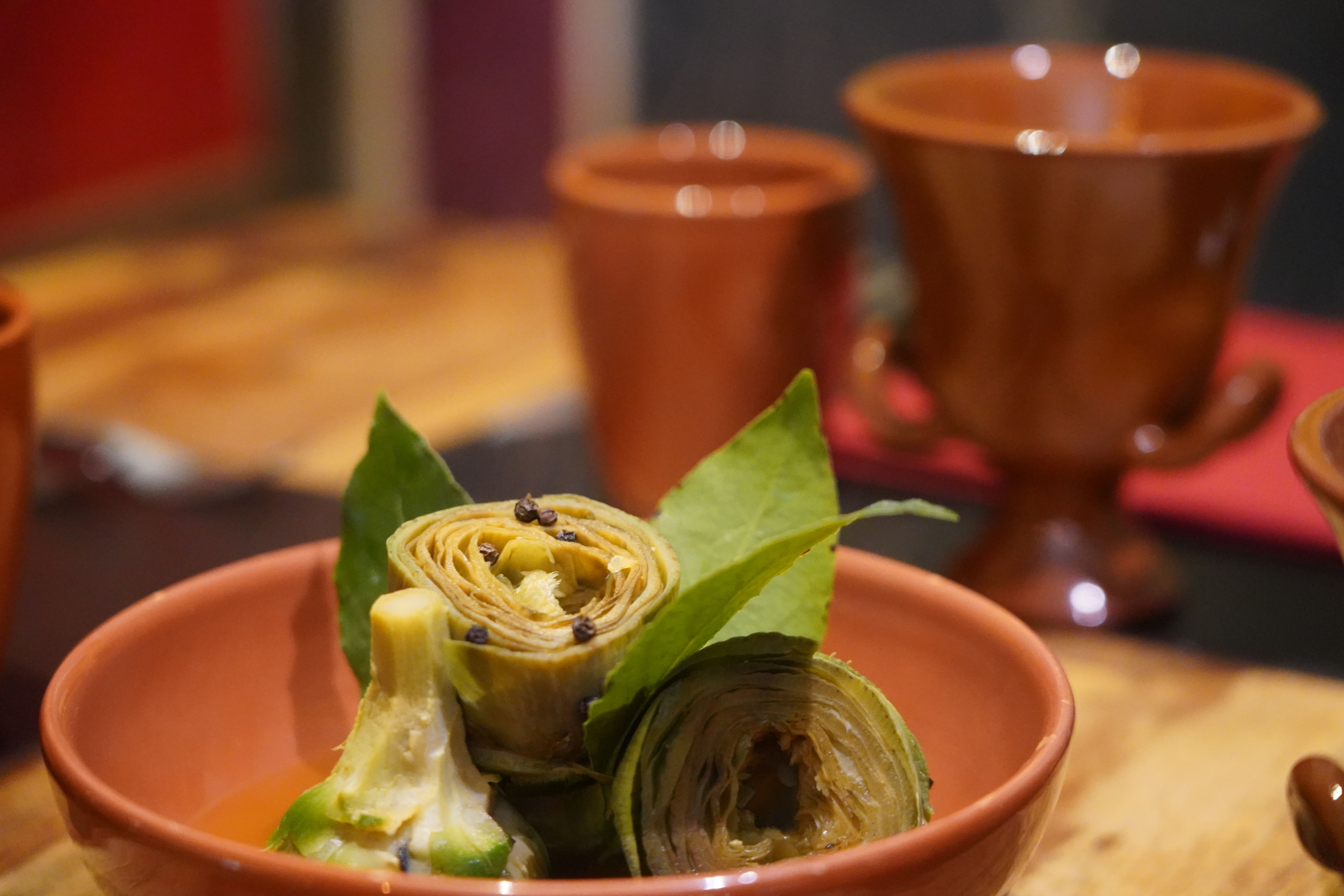- Cream of zucchini with cumin, fried artichoke with turmeric, toasted bread with garum and cod meatballs with thyme