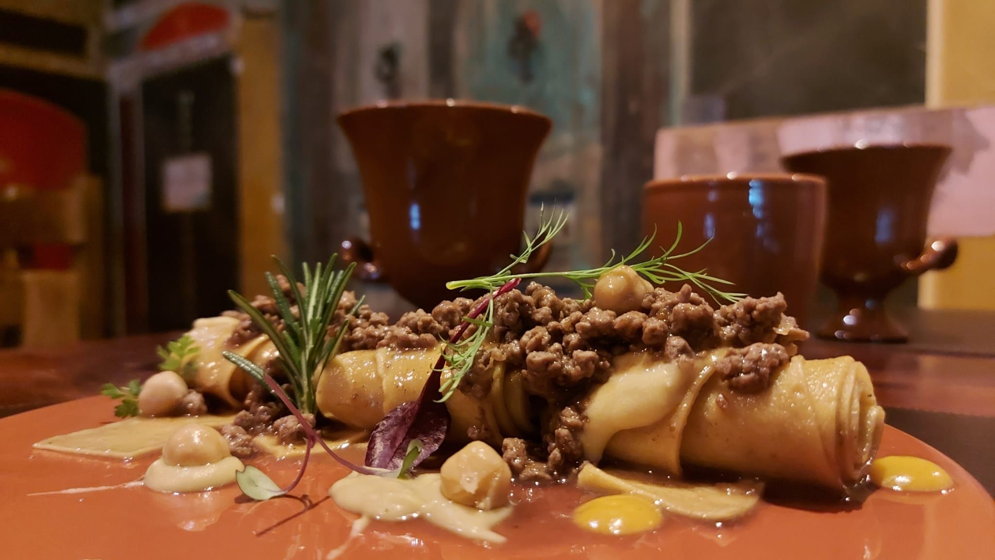 - Luculliano dish: Epiterium of black olives and rosemary, Trimalcione meatball, Savillum (first salt cheese with honey), hard-boiled egg with black sesame, toasted panis with garum, fried artichoke with coriander and yellow lupins