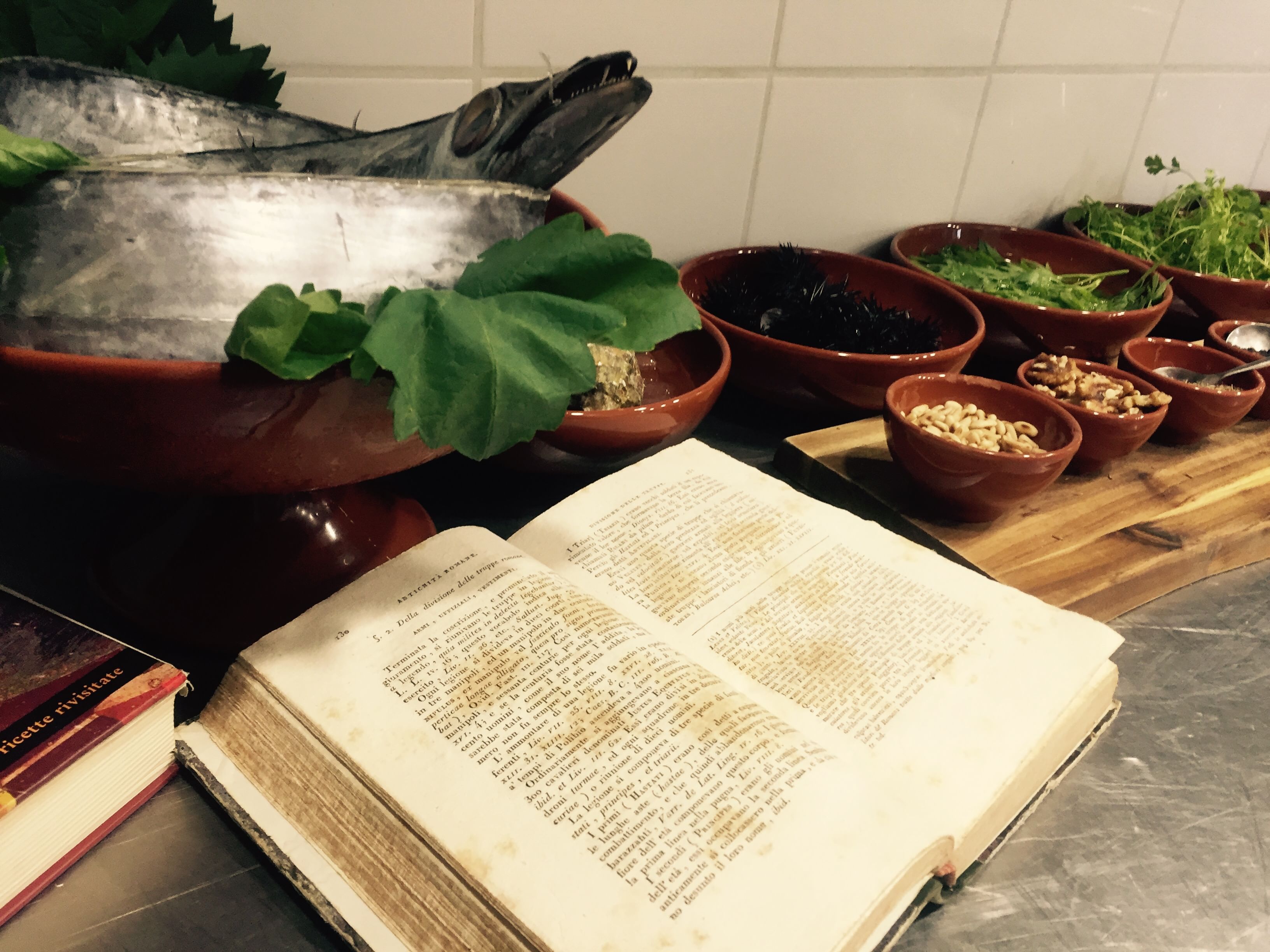 - Seared salmon with cumin, coriander, black sesame and farinaccio • * Guinea fowl stuffed with Pompeian panis, chicory and Apicius sauce