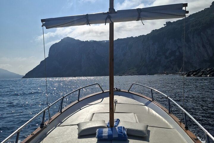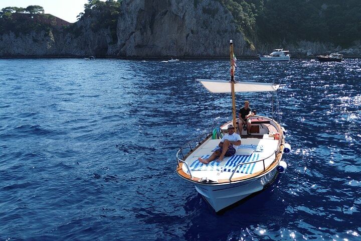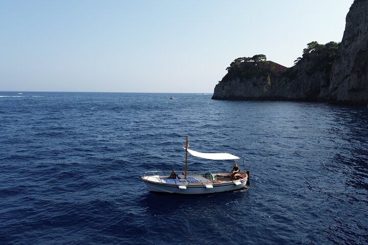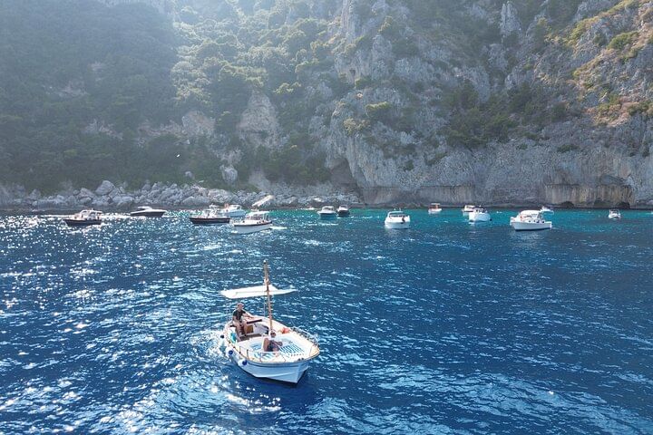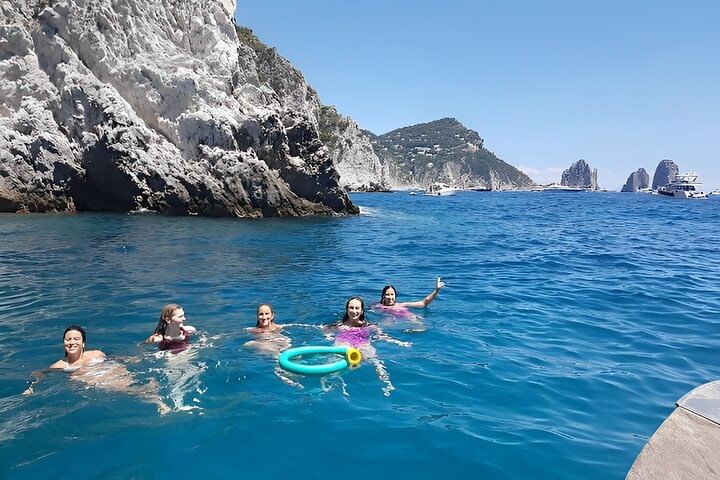 Discover Capri on a private 6-hour boat tour. Not a simple tour, but a day full of emotions: explore the whole island calmly, including caves, dives and relaxation. All inclusive: cold drinks (water, prosecco, wine, soft drinks), salty snacks, beach towels, masks (without snorkel and fins for hygiene reasons), personalized music with Bluetooth speaker. Possibility to go ashore (e.g. Marina Piccola or seaside restaurants) if requested. Boat reserved for your group, with experienced, friendly and attentive local skipper. Visit the caves at a safe distance, with the possibility of waiting to enter the Blue Grotto. Stops in dreamy coves for swimming and moments of relaxation with toast. Also perfect for creating social content: the skipper knows the most scenic spots for stunning photos.